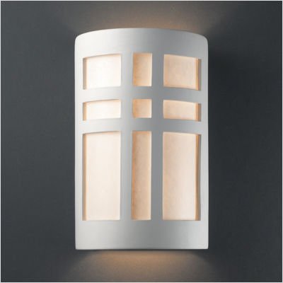 Product Descriptionp/pCER-7295-BIS-White Styrene Finish: Bisque, Shade Option: White Styrene Pictured in Bisque Features: -Wall sconce. -Ambiance collection. -Available in 30 hand-painted finishes as well as unfinished ceramic bisque which is paintable. -Available in white styrene (standard) or MICA shade option. -Ceramic construction. -Large cross window. -Open top and bottom. -Mica Shade is for indoor use only. -UL Listed for damp locations. -Eco-friendly. -Made in USA. Specifications: -Accommodates (2) 100W A-19 incandescent or (2) 26W GU24 fluorescent bulbs. -Mounting center: 4''. -Overall dime